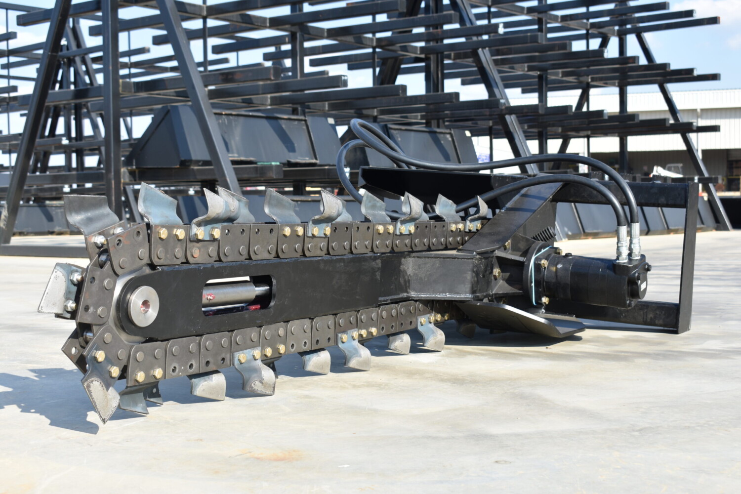 This skid steer trencher delivers unmatched power and precision for tough digging jobs. Its planetary drive delivers high torque for fast trenching, while the Dirt Tooth chain cuts through hard ground with ease. Built to last with an Ultra HD bearing, oversized auger, and quick-adjust side shift for maximum versatility.